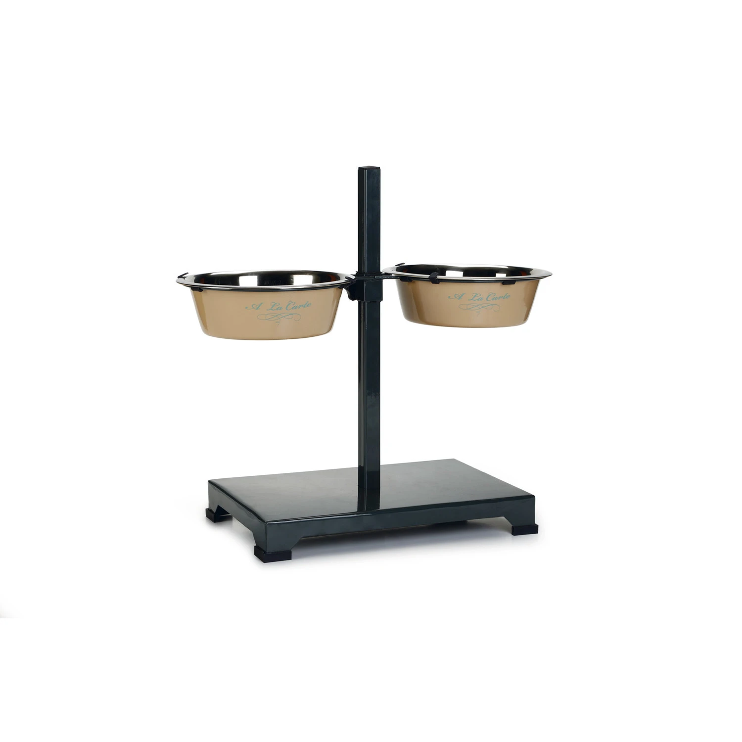 De Beeztees H-Standaard A la Carte is een mooie standaard met een voer- en drinkbak voor jouw hond. Deze standaard is in hoogte verstelbaar, zodat je zelf kan bepalen wat een fijne hoogte is voor jouw hond om te eten. De onderzijde van deze H-standaard is net even dan normale standaarden, waardoor het een unieke uitstraling krijgt. Bovendien bevat de onderkant dopjes, die dienen als antislip en deze zorgen er ook voor dat er geen krassen op de vloer komen. De naam A la Carte komt ook terug op de voer-en drinkbak.Â
