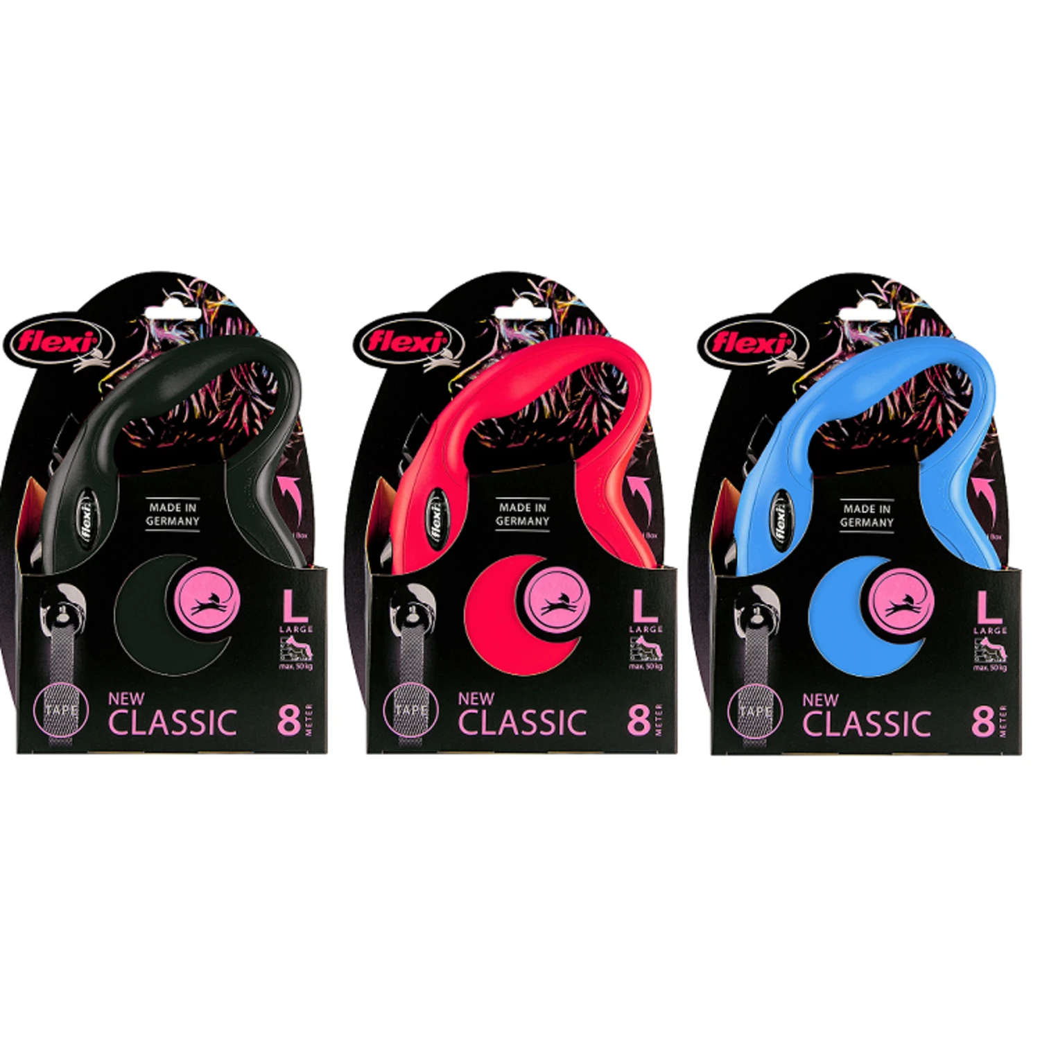 Het is mogelijk om de Flexi New Classic Tape L uit te breiden met de Flexi Multi Box (poepzakjes- of snackhouder) of het LED Lighting System (LED-lampje) (los te koop). De Flexi New Classic is verkrijgbaar in de maten XS, S, M en L.