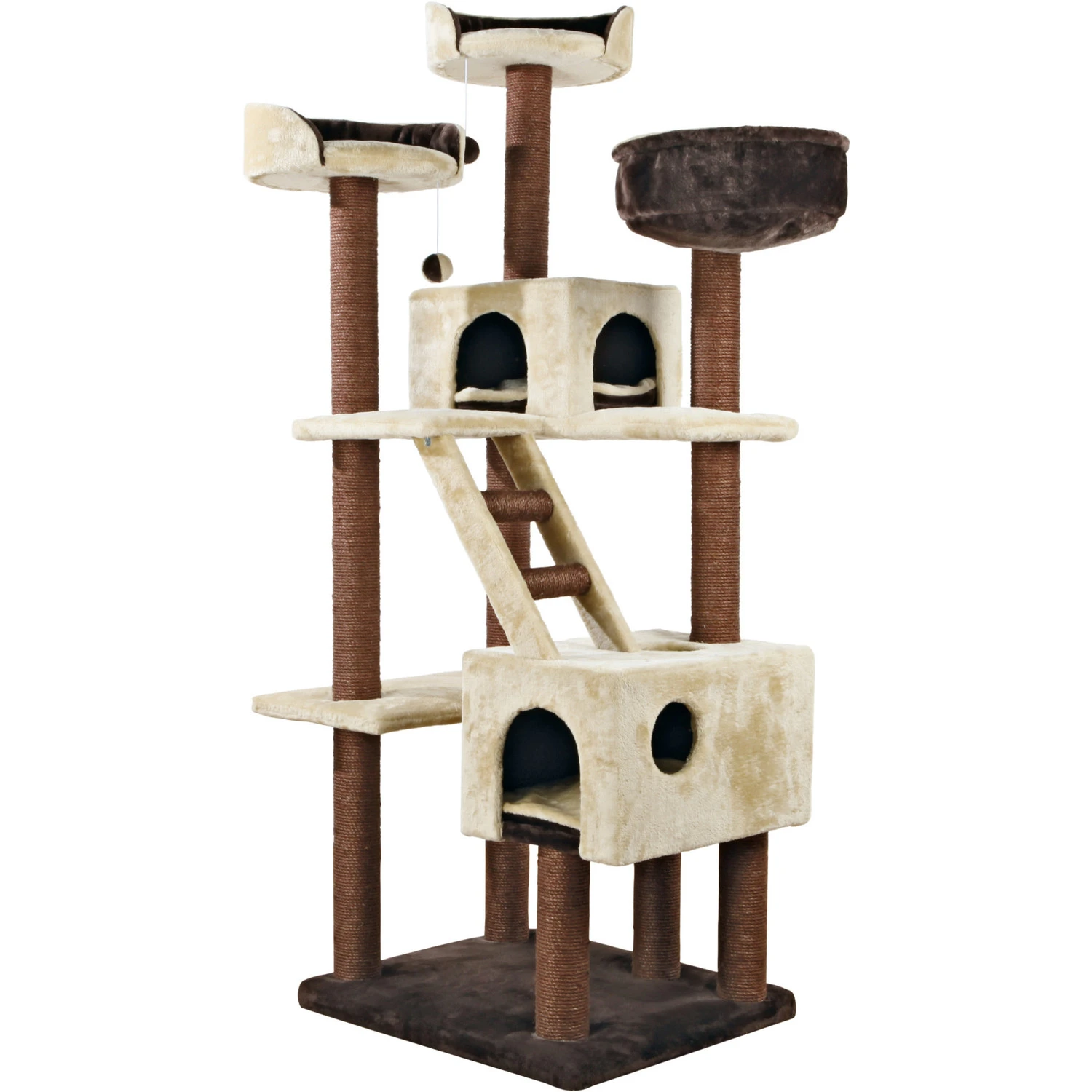 Krabpaal Felicitas is een eyecatcher in huis met zijn contrasterende kleuren en is een echte uitdaging voor jouw kat(ten). De krabpaal is 190 cm hoog en heeft 2 vaste verdiepingen met daarop 2 schuilhuizen. Boven de tweede verdieping zitten nog 2 eigen ligplaatsen en de derde is een hangmand. De paal heeft meerdere plekken waar jouw kat naar hartenlust zijn nagels kan onderhouden. Krab-, speel-, klim- en slaapplezier ineen!